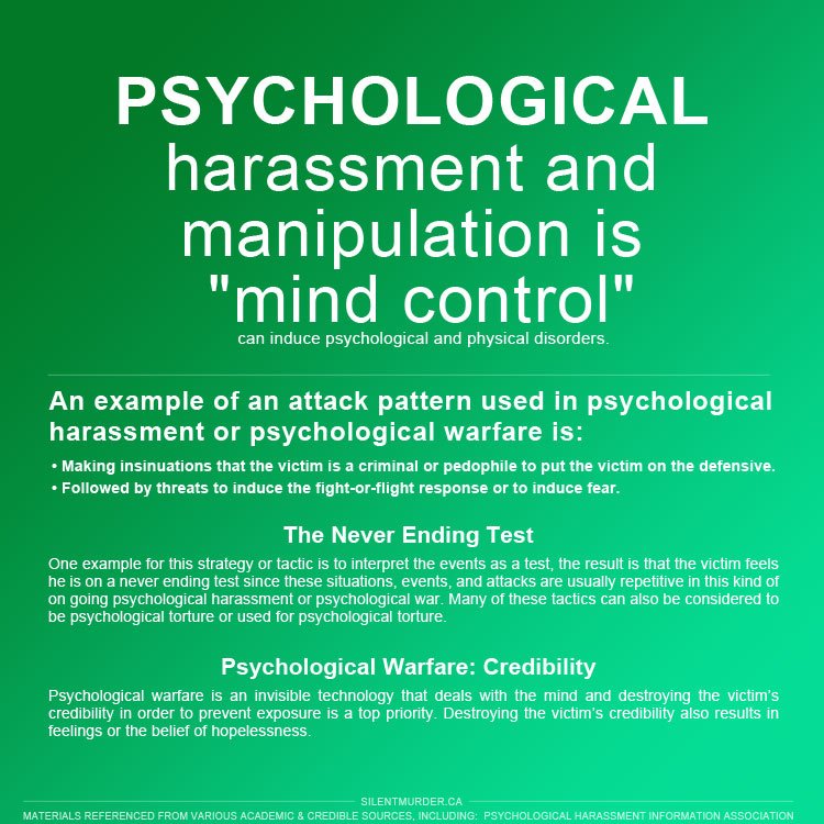Psychological harassment and psychological manipulation, “mind control,” can induce psychological and physical disorders. When an individual is targeted, harassment usually begins slowly and increases over time. Anytime someone interacts with you, they can influence and manipulate your thoughts…